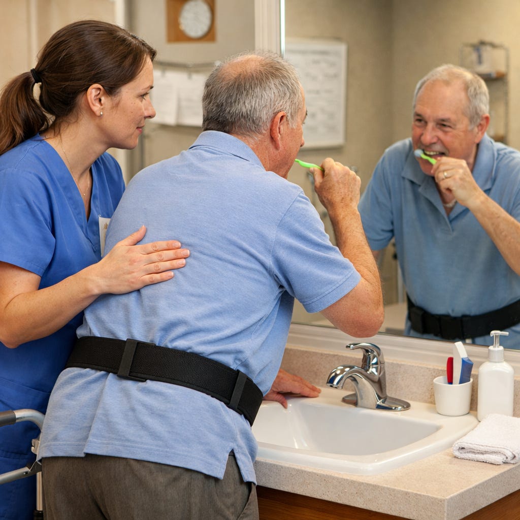 Consider a common inpatient rehab scenario. A client is working on grooming at the sink following a stroke. During the session, the OT emphasizes standing tolerance, one-handed task performance, and sequencing because of hemiparesis and impaired balance.