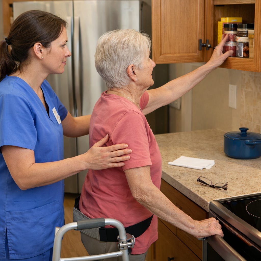This gap becomes especially clear in home health. An OT may address fall risk by working with a client in the kitchen, focusing on weight shifting, visual scanning, and safe item retrieval from cabinets. If the note only reports that a “kitchen task was completed,” the skilled reasoning behind the intervention is lost.